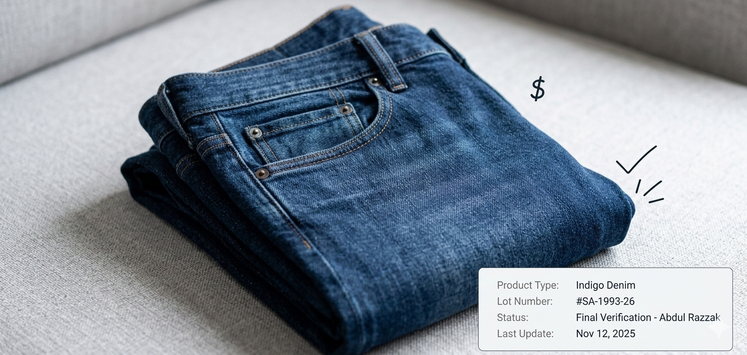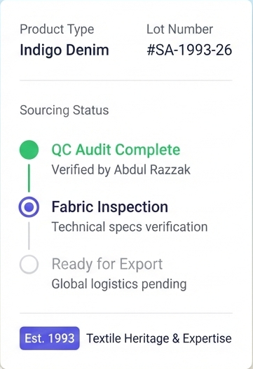 Every lot in our catalog includes detailed specifications (composition, GSM, weave) and QC audit summaries verified by leadership with a career dating back to 1993.